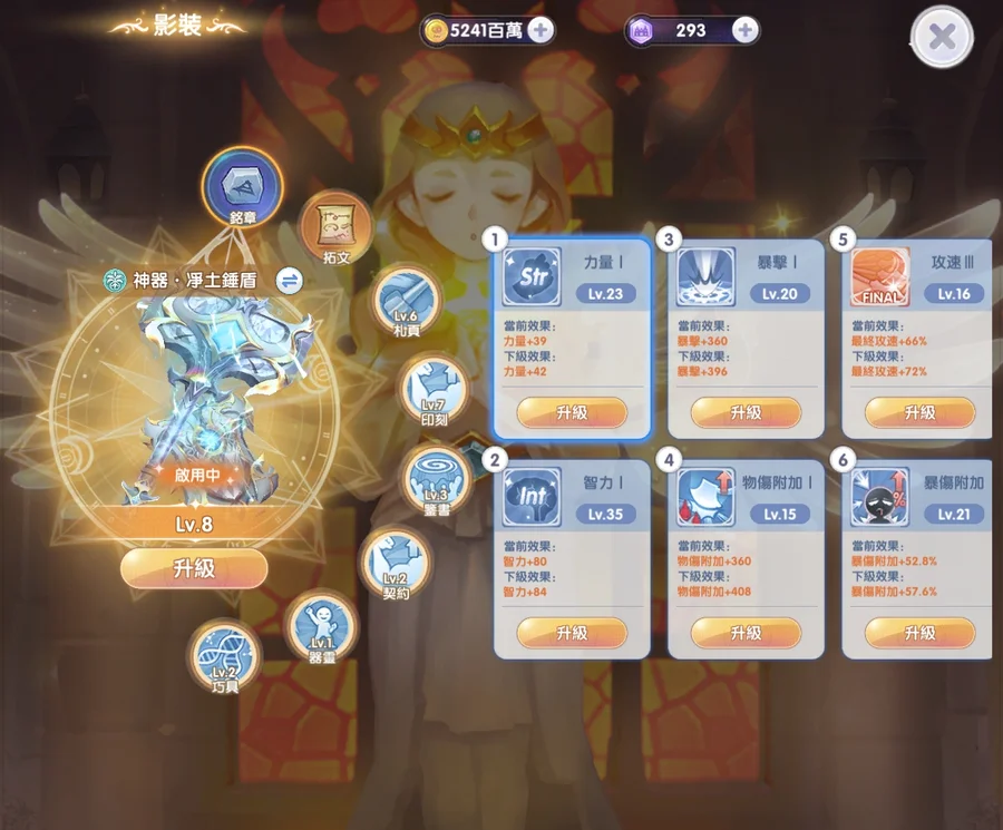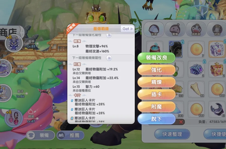 強6影8精3附8 體型有大中小 練等掛機可以切換射手身上還有三萬鑽 大概夠買3~4期通行證 附魔再慢慢轉換階段