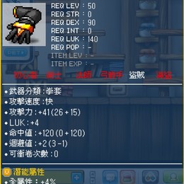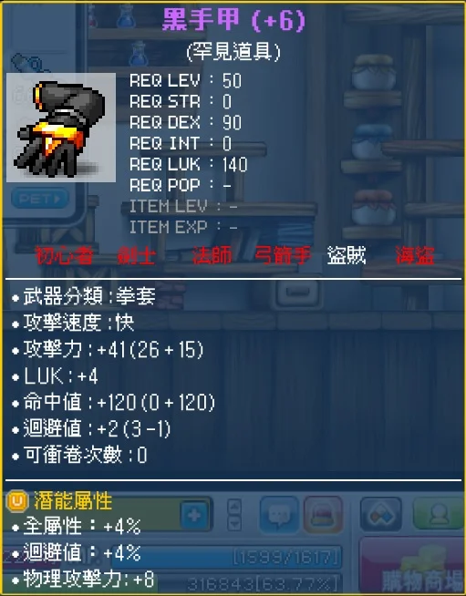 【黑手甲41攻】【3排罕見潛】【全屬4%+8物攻】同級最強武器【盜賊50等必備】
